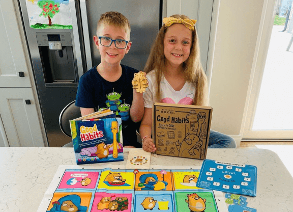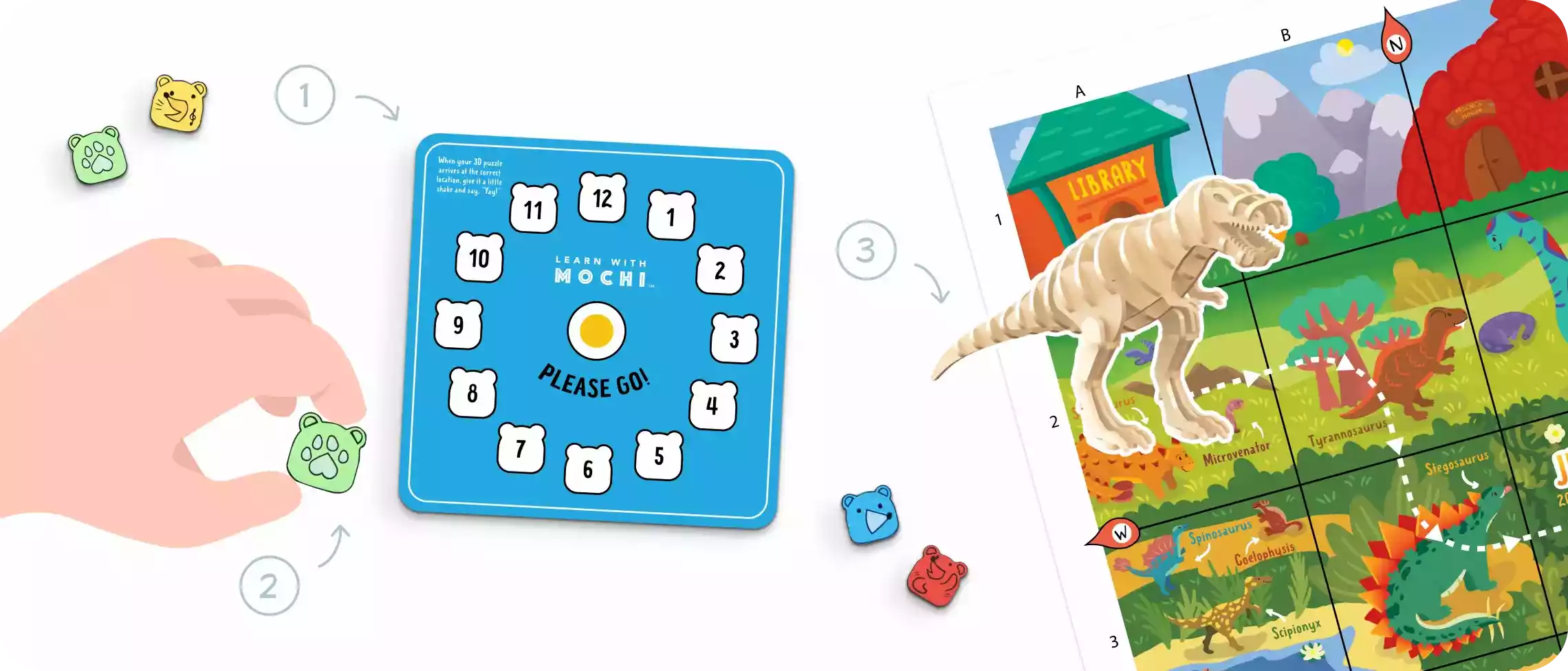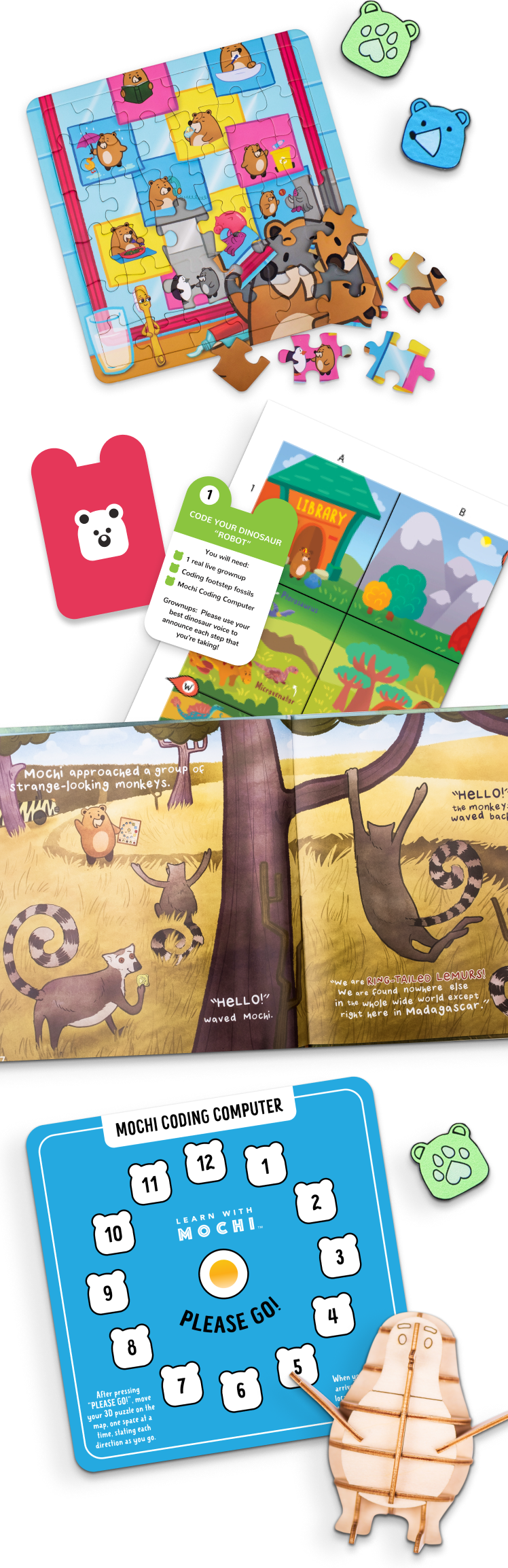 Every Mochi box comes with a “Mochi Coding Computer” (1) which has spaces for coding blocks. (2) Kids place their wooden coding blocks in the correct sequence and then help their character (3) execute the sequence on their map.