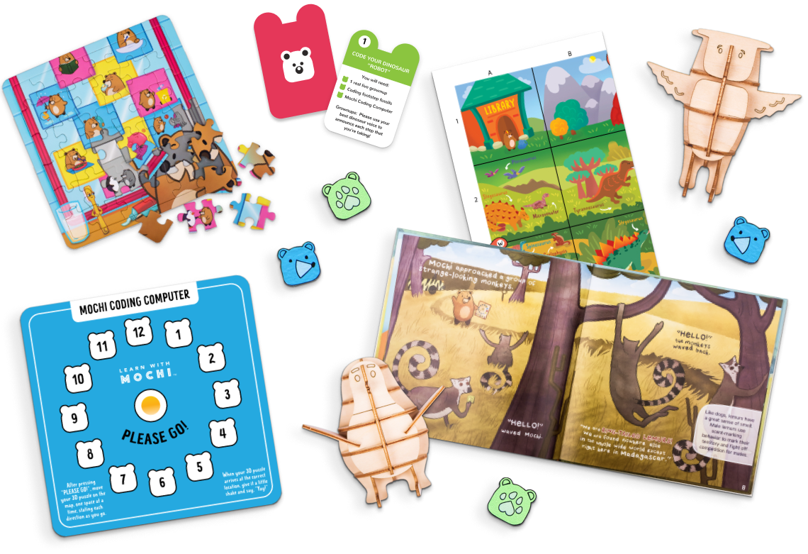 Each box includes a beautifully illustrated book about a subject children love, such as our first box — DINOSAURS. There’s a 3-D puzzle relating to the book, which you and your child can assemble, and a matching story map, so your child can retell the story by “coding” their puzzle figure around the map.